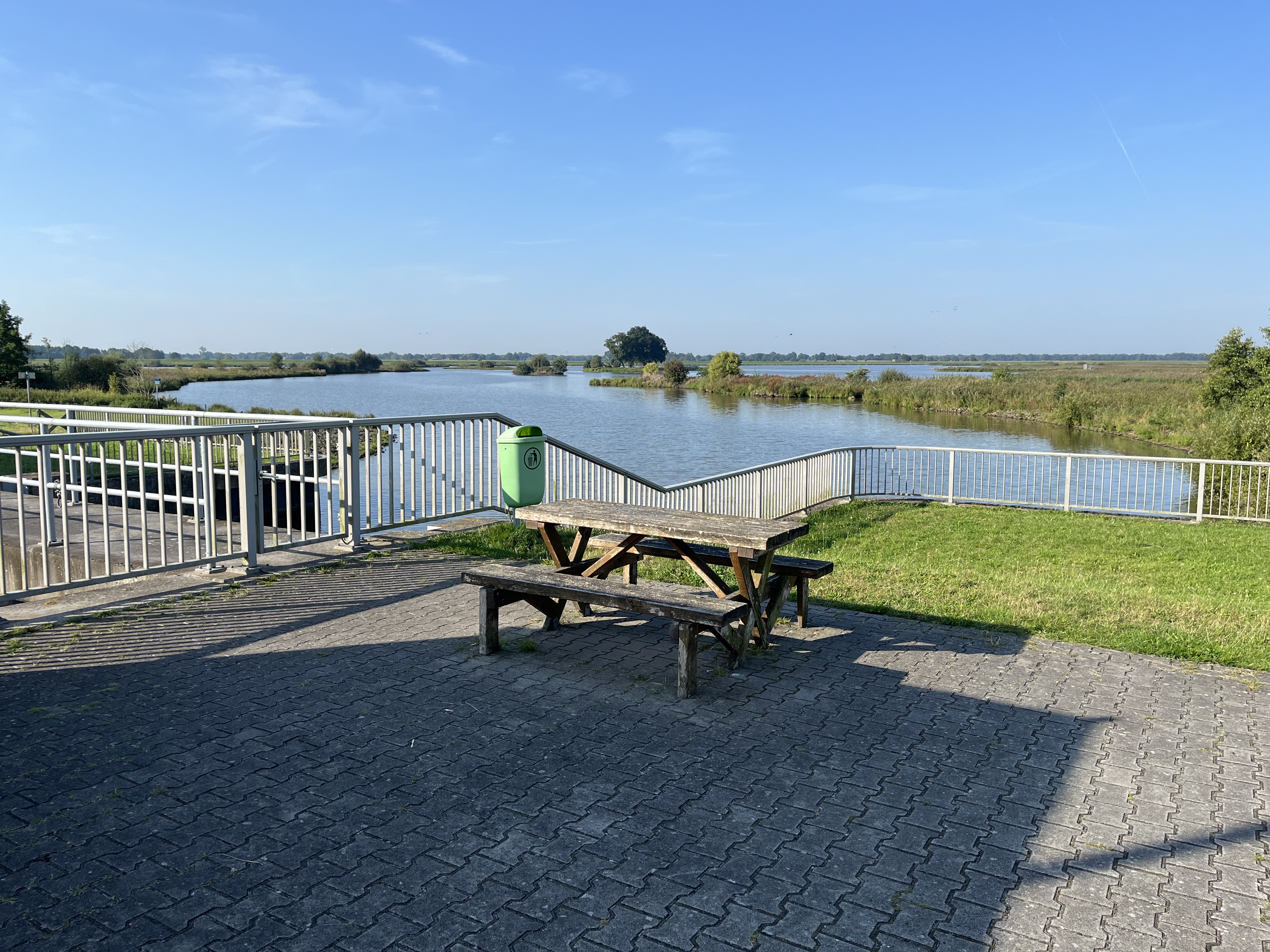 Rastplatz am Sperrwerk am Aussichtsturm vom Naturschutzgebiet Polder Holter Hammrich und direkt am Rundkurs (Deichstraße). In unmittelbarer Nähe befindet sich die Aussichtsplattform mit drei Informationstafeln und Blick auf das Wasser mit den Inseln und eine Angelstelle.